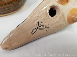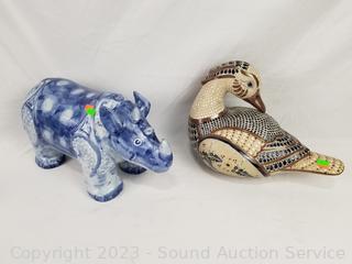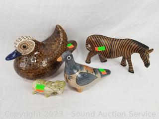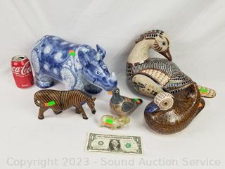 Lot Details: Carved wood Zebra, Stone Hippo, Porcelain Rhino, 3 signed Mexico pottery birds, hand painted, crafted. Approx. 2" to 10" tall.