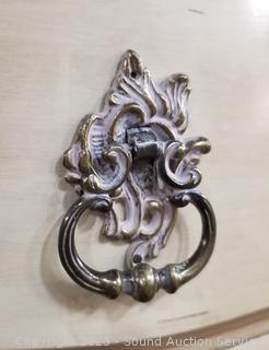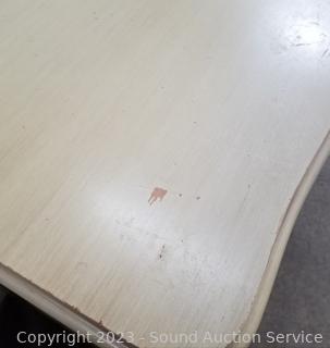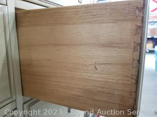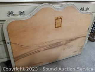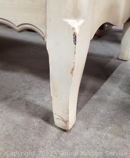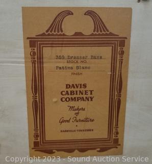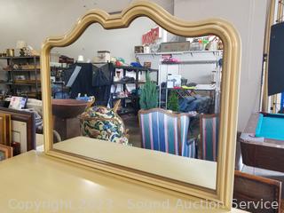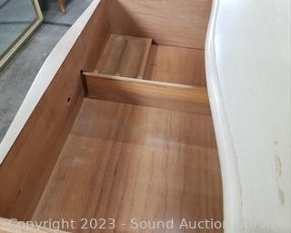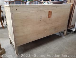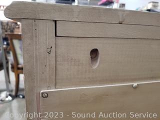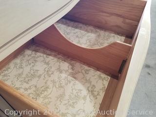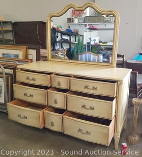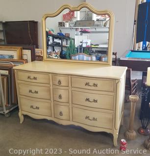 Lot Details: Distressed ivory? finish, various scuffs & wear. Solid beech wood construction, dovetail joinery. 2 of the top drawers are Divided, 35" H x 60" W x 22" D with 35" H x 45" W mirror.