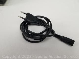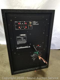 Lot Details: DVD player untested, has European plug, requires AC power .1 tower speaker, 1 bookcase speaker, 1 center speaker, 1 subwoofer, speakers all work. 1 has some damage, dent on speaker, sub has dent on back corner, not getting sound using speaker out, all have wear from use.
