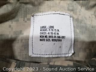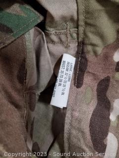 Lot Details: Altama Tactical Combat boots S:8.5, 7.5, canteens, Medical Tactical backpack, Various sizes of fatigues, Pants S:L Large Long, Medium Regular, combat shirt S:L, Large Long, Medium Regular.