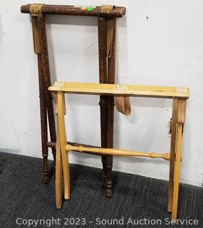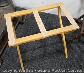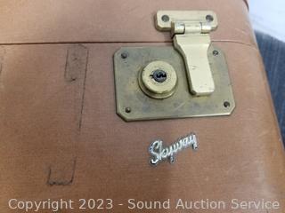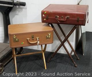 Lot Details:  All with various wear from age, use. 19.5" H  x 22" x 14" & 30" H x 18.5" x 17" luggage  stands, 19.5" x 26" x 8.5" Skyway & 19.5" x  26" x 8" Samsonite.