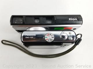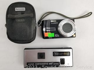 Lot Details: Kodak Colorburst 100 Instant Camera, Panasonic Lumix DMC-TZ3 digital camera, Kodak Pocket Instamatic 50 Camera, Canon Sure Shot Telemax film camera, Fuji DL-200 film camera.
