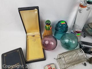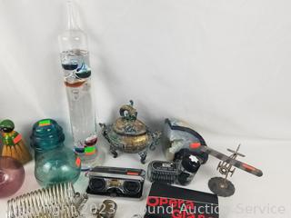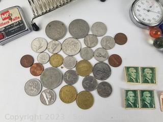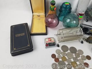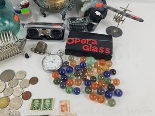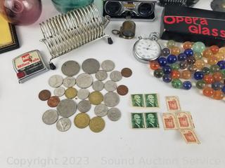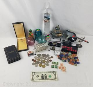 Lot Details: Galileo Thermometer, Travelers opera glasses, polished geode, marbles, floats, insulator, foreign coins, loop, Select 1/5 mechanical stop watch & more.