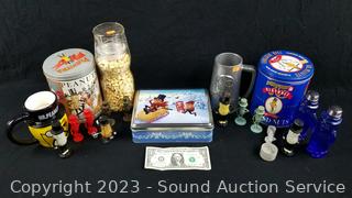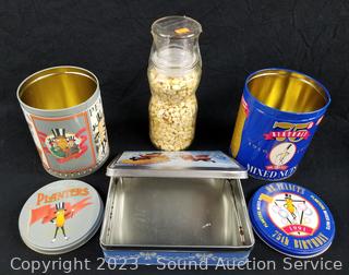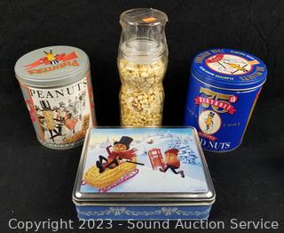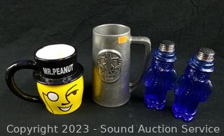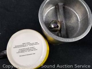 Lot Details: Pewter mug w/bell, tins, coffee mug, peanuts jar, salt & pepper shakers. Refer to photos for more info.