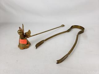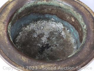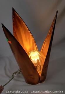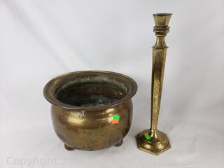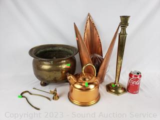 Lot Details: Also comes with etched brass 16" candle holder, snuffer, tongs. 8" H x 11" Dia, hammered copper pot (has a hole in the bottom make a great planter pot), 15" H x 9" lamp (works).