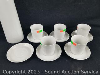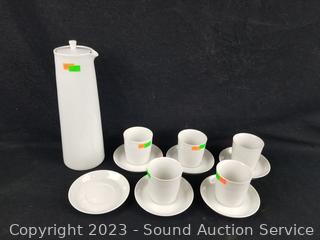 Lot Details: 5 cups, 6 saucers, tea/coffee pot. One cup has a small chip on rim, don't see any issues.