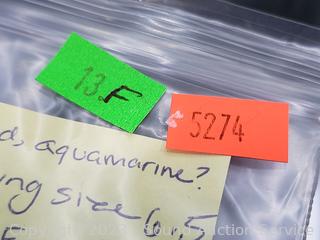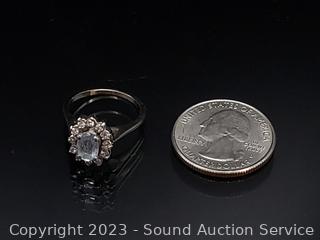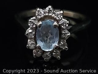 Lot Details: Marked 14K "Blue Fire", engraving is worn off. Blue Stone tested aquamarine, iolite, jadeite, nephrite, paraibe. White stones tested diamond. TW:3.3g.