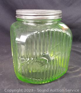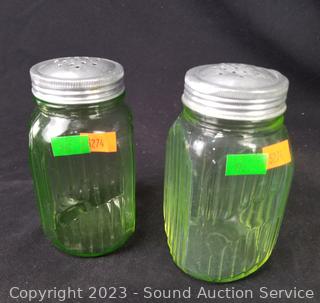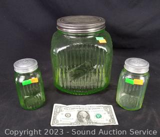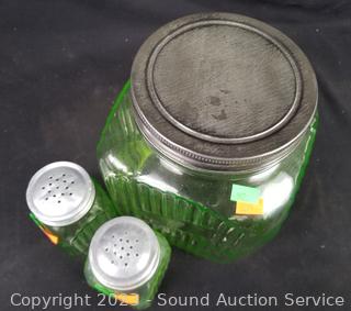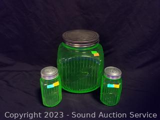 Lot #0192: 3pc Uranium Glass Canister & 2 Shakers