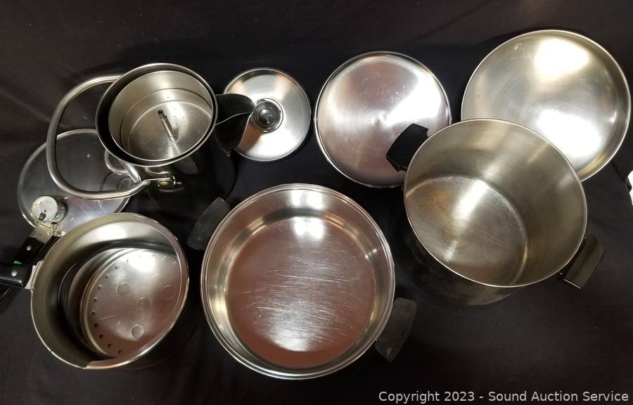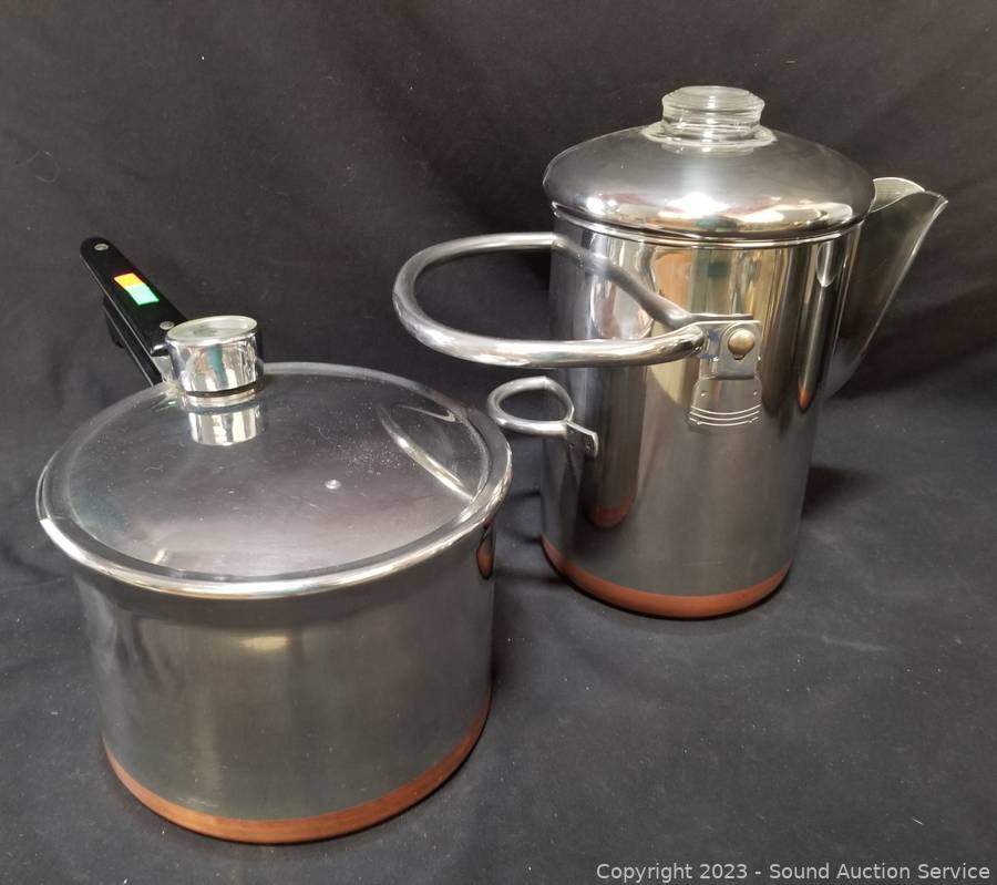 Lot Details: Coffee percolator, pressure cooker, 4.5" to 8" H x 9" to 10" Dia. boiling pots. In great condition.