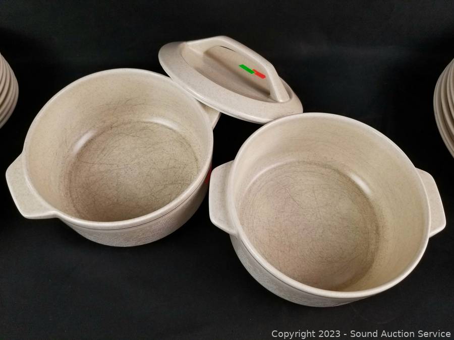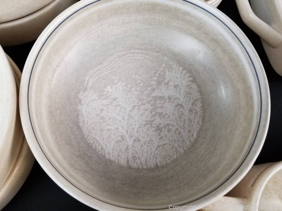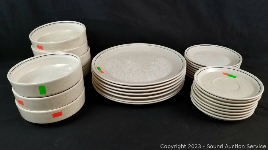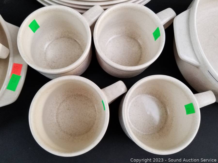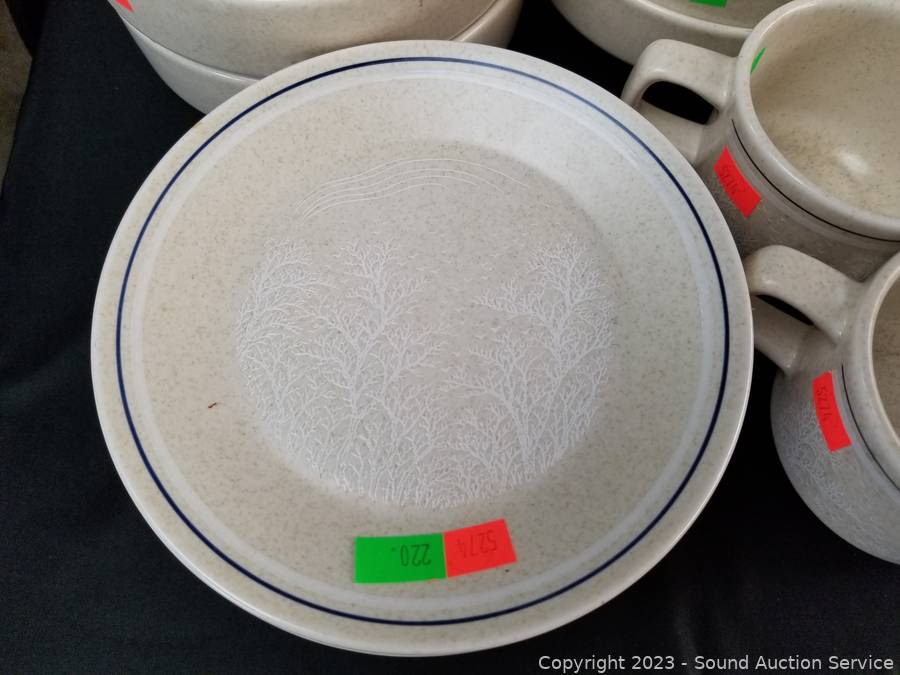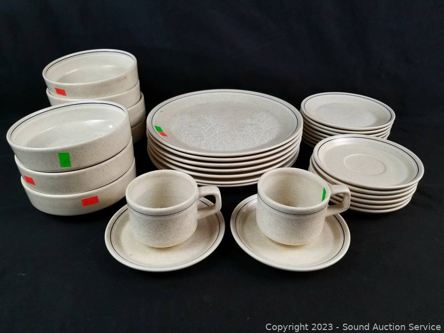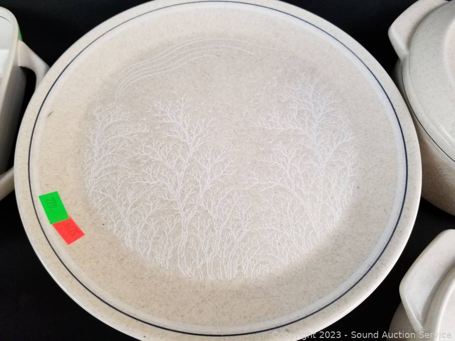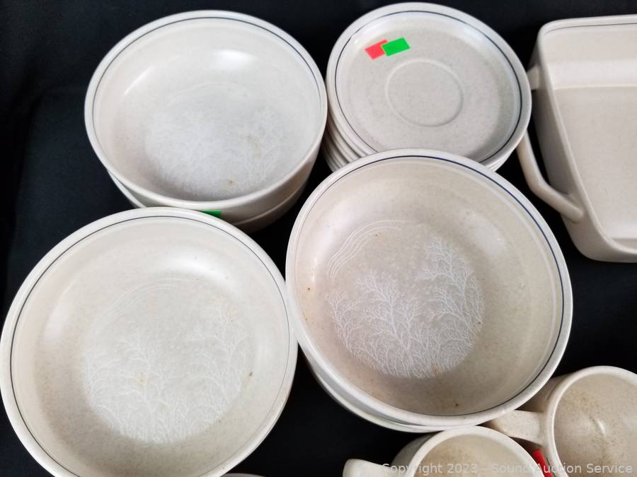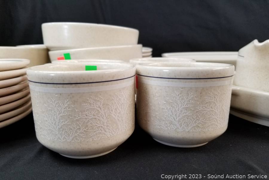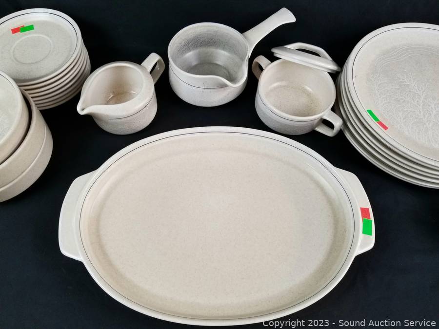 Lot Details: 8 cups, cream, sugar, gravy boat, 7 dinner plates, 8 snack plates, 8 saucers, 7 bowls, (2) 7" serving bowls (1 with lid), 14" x 9.5" tray, 13" x 8.5" baking dish.