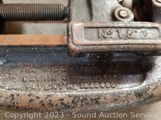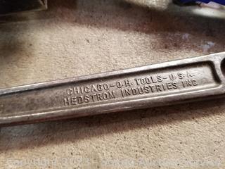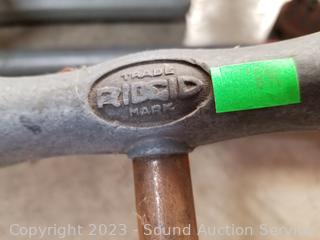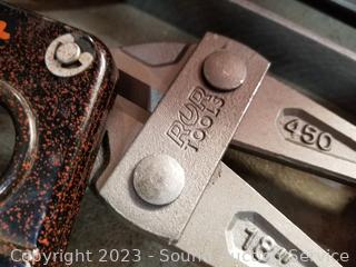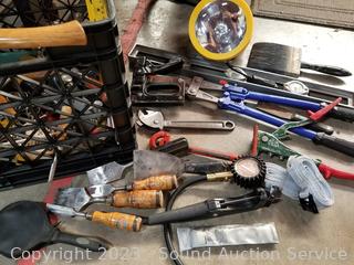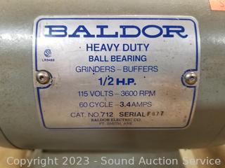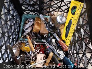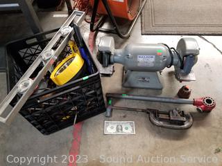 Lot Details: Baldor 1/2 HP Bench Grinder - Parts/Repair - Cord has been cutoff. Crate full of tools, level, spot light, bolt cutters, hand drill, wire brushes, staple gun, pipe cutter, pipe die & more. Refer to photos for lot contents.
