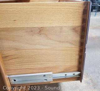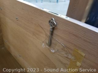 Lot Details: Skeleton key locks with key. Ball bearing drawer guide on drawer. 3 felt lined shelves with plate grooves. 82" H x 25" to 28" W x 12.5" to 16.5" D.