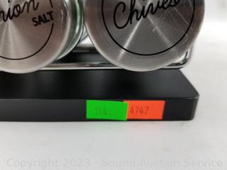 Lot Details: Rack holds 20 jars. Parsley lid has a dent, all lids have tape residue. All full or labeled spices.