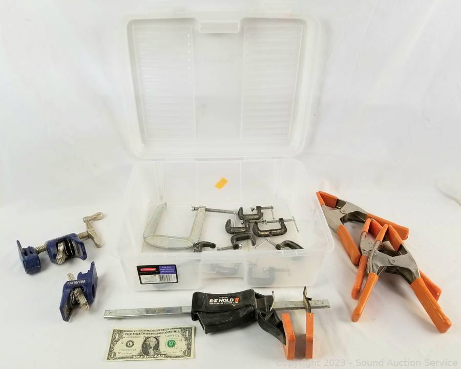 Lot Details: 1" "C" clamps, 9" spring clamps, Jorgensen 12" quick clamp, Kobalt 1" bar clamp hardware. 6" x 16" x 13".