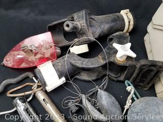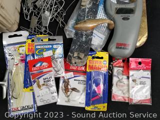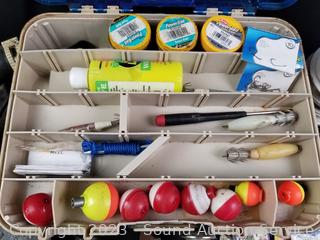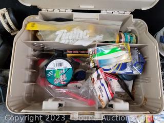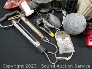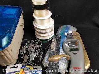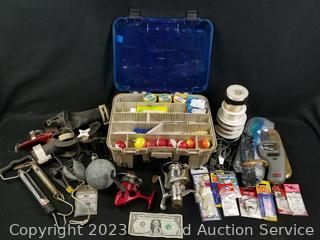 Lot Details: 3.5" Lead weight, reel, rod holders, string, tackle, tackle organizer. Refer to photos for lot contents.