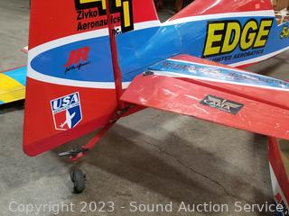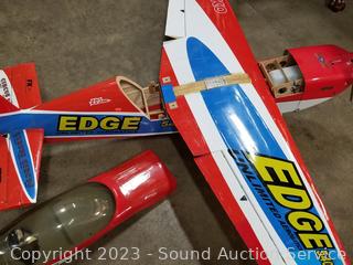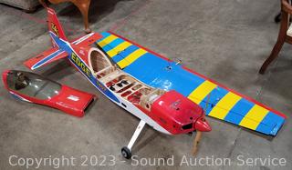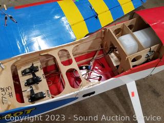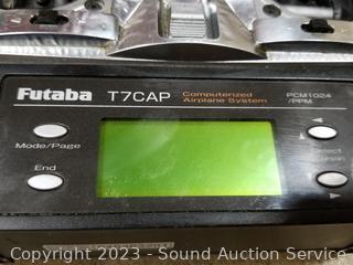 Lot Details: Gas engine, appears to have most or all of the electronics, 5051 Engine, appears complete. 68" long, 72" wingspan. Some signs of wear from use. Futaba T7CAP controller.