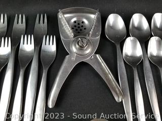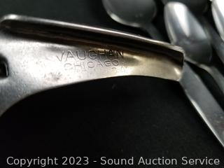Lot Details: 12 lg. forks, 12 sm. forks, 12 lg. spoons, 12 sm. spoons, 12 lg. spreaders, 10 sm. spreaders, 12 long spoons, 2 serving spoons, 1 serving fork.