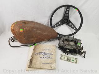 Lot Details: Also comes with 1" steering wheel, 1964 Corvette Shop Manual, 1962 Corvette Servicing Guide, Motorcycle Gas Tank (various rust and wear to finish). All various wear from use, refer to photos for condition.