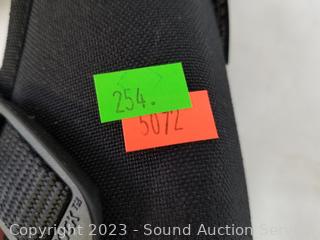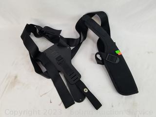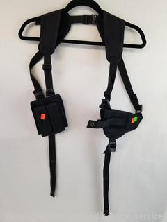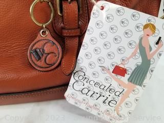 Lot Details: Concealed Carrier Leather Handbag, appears unused, has original shipping receipt with hand written price of $309, 2 nylon shoulder holsters & front draw swivel holder. All in excellent condition.