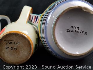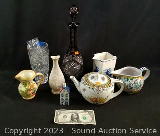 Lot Details: Clear crystal vase, ruby cut to clear decanter, Lenox vase, pitcher, R&S Germany Teapot, Deruta Italy pitcher.