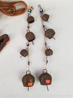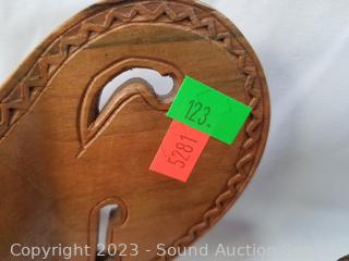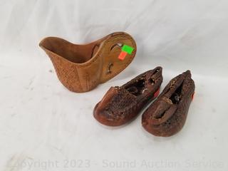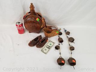Lot Details: Carved wood bottle with bells 12" H x 8" x 4", carved cup marked Yugoslavia, leather Opanka child's shoes, small tear in leather, c.1950's-60's.