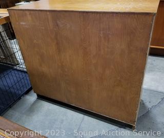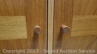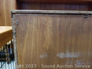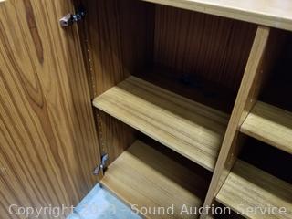 Lot Details: Particle board construction, teak veneer finish. Comes with Spare shelf pegs. Veneer is chipped on bottom right side, comes with piece taped inside. Don't see any other issues. 35" H x 35.5" W x 16.5" D.