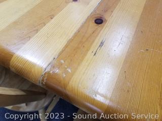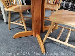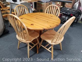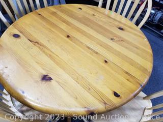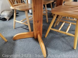 Lot Details: Natural wood finish. Some signs of wear from use. 29.5" H x 42" Dia with (2) 17" leaves.