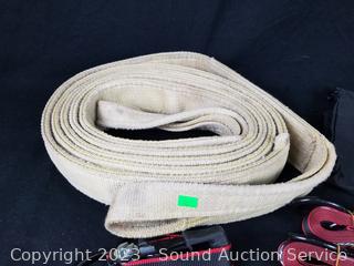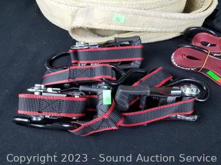 Lot Details: 500lb ratchet straps. Liftall 17,200lb basket strap, 8,600lb vertical, 12ft long.