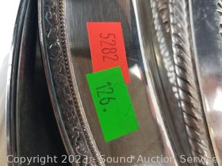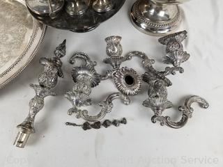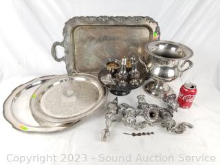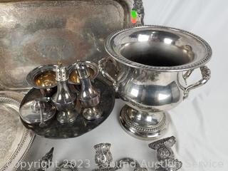 Lot Details: Ice bucket, charger, tray's, salt & pepper, candleholders, oil sterno. Rogers, Crown English hallmark, others.