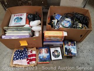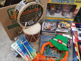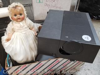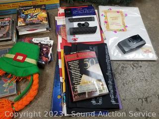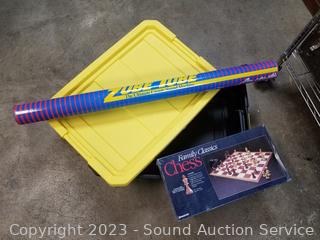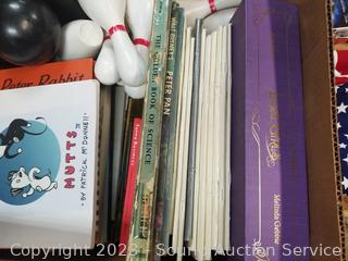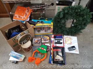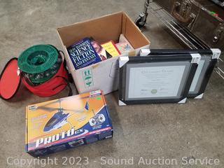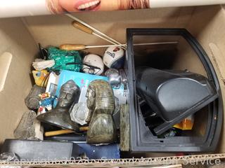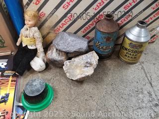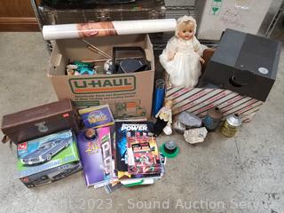 Lot Details: Cart NOT included. Petrified wood, stones, plastic bowling pins/ball, Revell Proto RC helicopter (battery not charging), sealed chess set, dolls, small pet kennel, small tote with lid, sealed Jones Soda holiday pack, old suit case & more. ATTN: Items may be missing pieces, damaged, not functioning, complete, no issues, etc. All items as is. Refer to photos for lot contents.