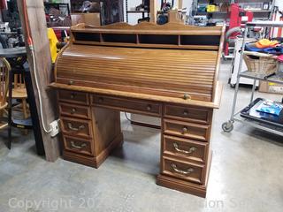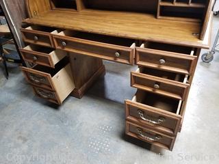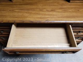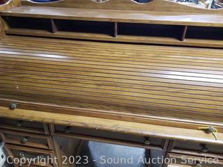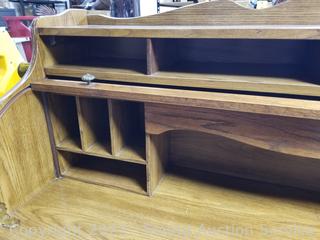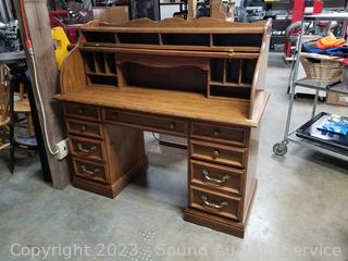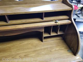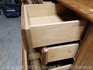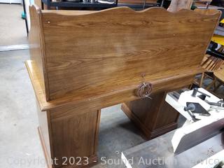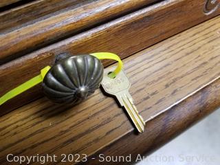 Lot Details: Various scuffs & wear to finish, particle board construction, oak wood grain finish. 49" H x 54" W x 24" D. Locking with key.
