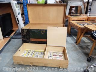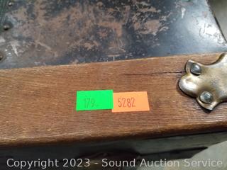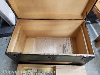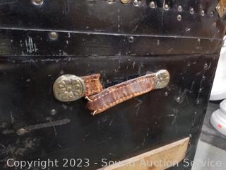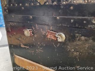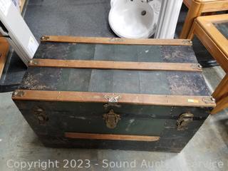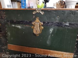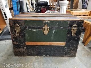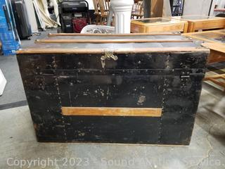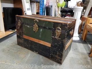 Lot Details: Missing a handle, other handle broken, lock & latches intact, no key. Wood banded, steel wrapped. 20.5" H x 32" Wx 17".