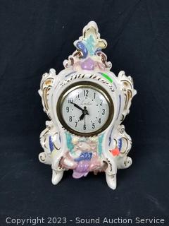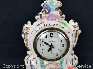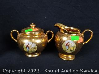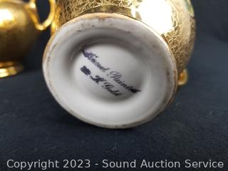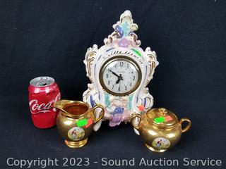 Lot Details: Hand painted 1920's-40's 22K gold painted cream & sugar. 1950's Lanshire Porcelain mantle clock, works, 11" H x 7" W, dirty, could use a thorough cleaning.