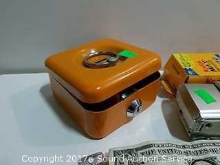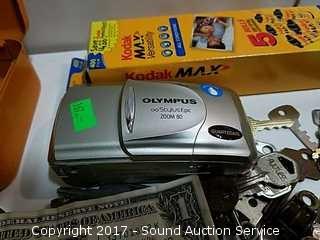 No key on the lock box, might be in the pile of keys. Camera is Olympus Stylus Epic Zoom 80, works! Comes with extra rolls of film.