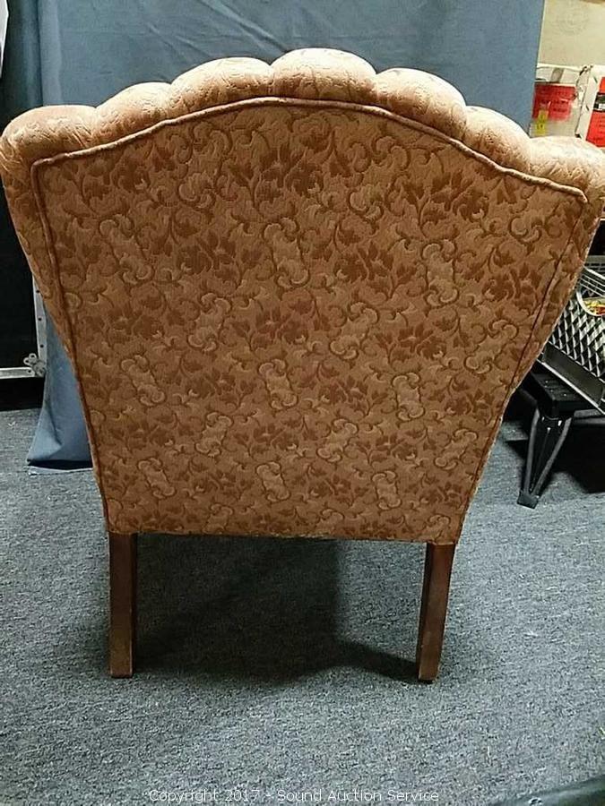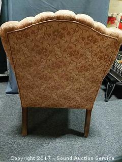 Does not have a tag, but upholstery matches that of the arm chairs and sofa, lots 4, 5, and 6. In very good condition, came from a clean home, well taken care of. Approx. 16.5" to seat, 22" wide seat. Overall 36" tall, 25" wide and 23" deep.