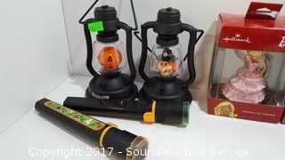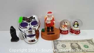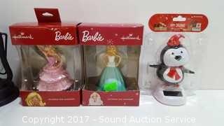 Includes: (3) NIP Barbie ornaments, (8) miniature snowglobes, MLB figurines, skull trinket dish, Halloween lanterns and more.
