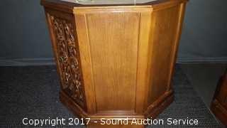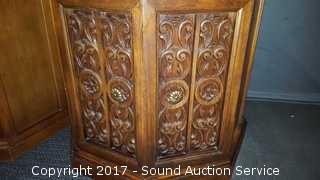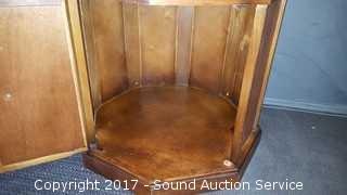 Carved doors, some minor surface scratching on the top and slight staining inside. Approx. 21" tall, 24" octagonal.