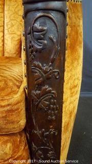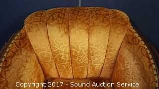 Made by Hi-Line Custom Made Furniture Burian. Gorgeous hand carved carved wood accents (some fading on the finish), with a vibrant orange scalloped upholstery. In excellent condition. Came from a clean home, well taken care of. Approx. 16" to seat, 20-1/2" wide. Overall 36.5" wide, 31" tall and 33" deep.