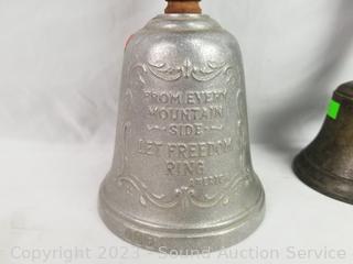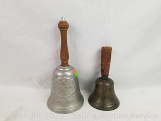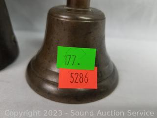 Lot Details: Old brass bell hand carved handle 7" H x 3.75" dia, "A Anchor G" hallmark with quote, 10" H x 4.5" dia. Old brass bell 4.5" H x 2.5" dia. Olde 5" cow bell. Various wear from age, use.