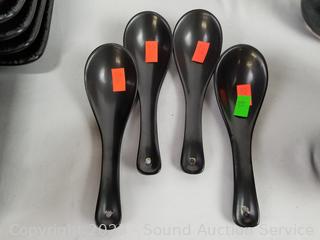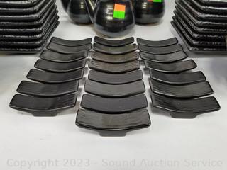 Lot Details: 22 chop stick rests, 3 small tea pots, 19 small 4.75" miso bowls, 4 ramen spoons, 24 5" snack plates, 24 7" lunch plates.