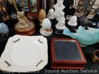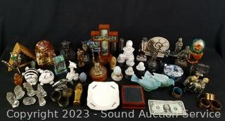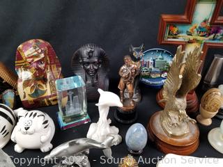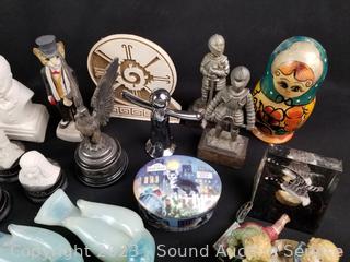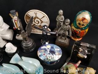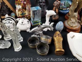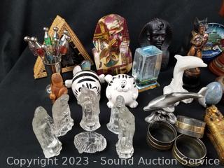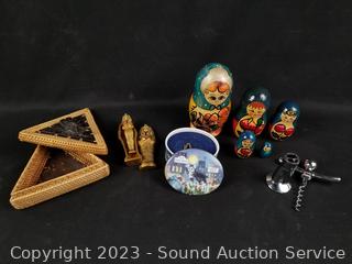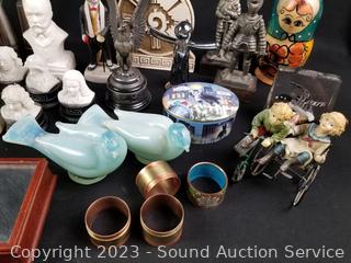 Lot Details: Various figures, appetizer pokers, napkin rings, copper, glass, brass, ceramic figures, Russian nesting doll & more. Refer to photos for lot contents.