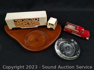 Lot Details: Cast metal truck & trailers, matches, plaque/sign, ashtray, patch.