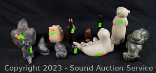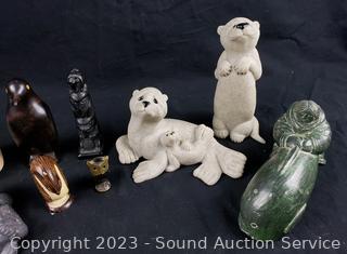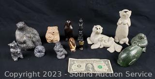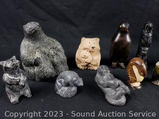 Lot Details: 5 Hand made Inuit Wolf Original figures, Rinconada bear figure, hand made Austria brass owl, Quarry Critters figure & more unmarked. Approx. 1.5" to 6" tall.
