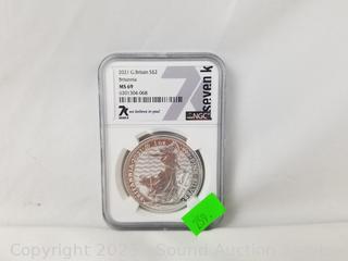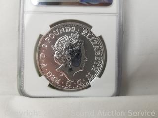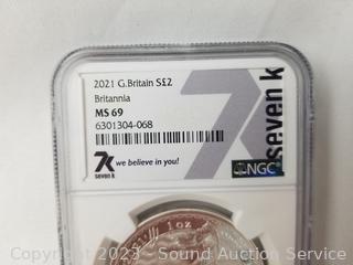 Lot #0259: Graded MS69 2021 1oz Fine Silver G.Britain 2£ Coin