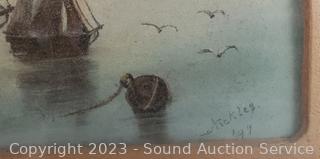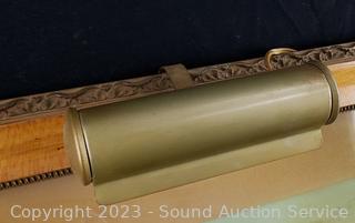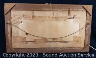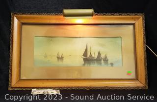 Lot Details: Refer to photos for signature. In old antique gold gilt frame (some damage to the gilding). With mounted down light. 18" H x 31.5".