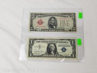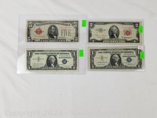 Lot Details: 1928C $5 Red Seal note, 1953A $2 Red Seal note, 1957 $1 Blue Seal Star note, 1957B $1 Blue Seal note. ATTN: We are not coin or currency experts or graders, please use your own judgement when bidding.