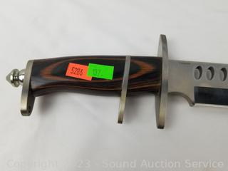 Lot Details: Surgical steel, made in Taiwan. 13" long, 7" blade, leather sheathe. Sharpened blade, in excellent condition.