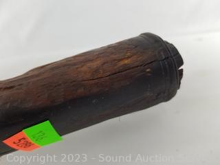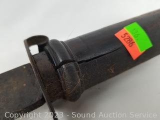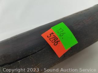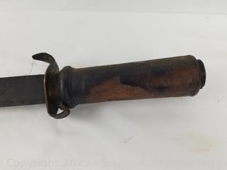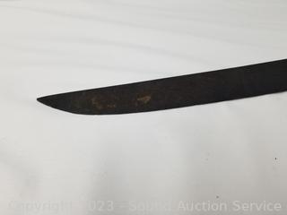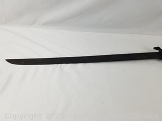 Lot Details: Blade is a bit warped, wood handle has a crack. 29.5" long, 24" blade. Blade looks like it has been oiled to prevent rust, could use a thorough cleaning. Or leave as is for that aged look! Don't see any makers marks.