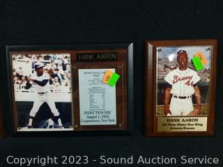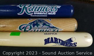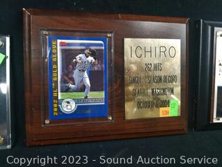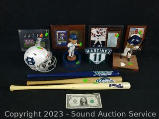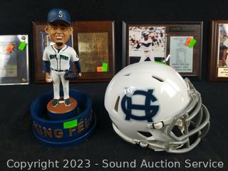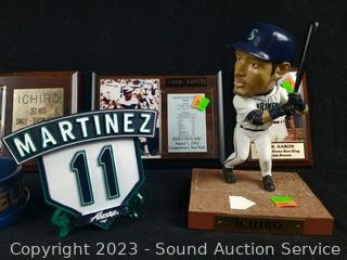 Lot Details: 3 miniature wood bats, Seattle Mariners, Tacoma Rainiers, Gig Harbor Miniature football helmet, Ichiro figure, King Felix bobble head, Hank Aaron & Ichiro plaques.