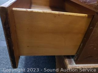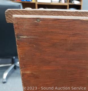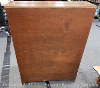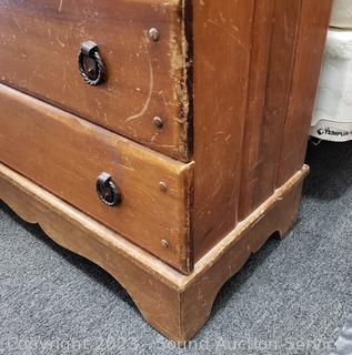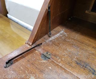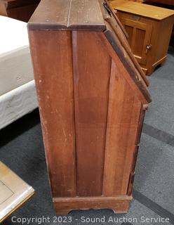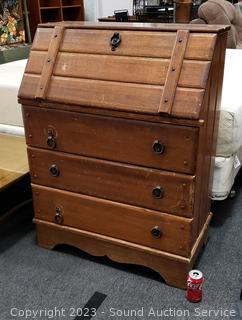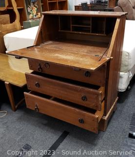 Lot Details: Missing one of the screw hole covers on top drawer, various scuffs, scratches in finish. Wrought Iron style pulls, one hinge for drop front is broken. As is. 41" H x 30.5" W x 16" D. Appears to be solid wood construction.